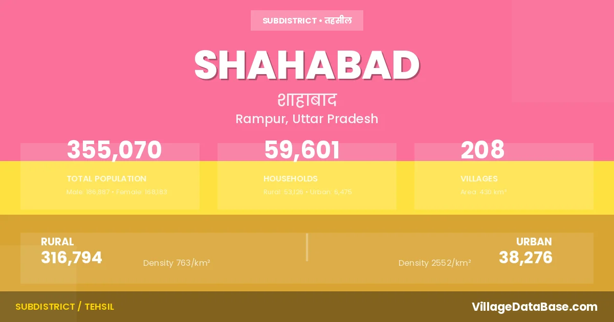 According to the 2011 census The total area of Shahabad Tehsil is 430 km², with a population of 355070 people. The population density is 825 inhabitants per square kilometre, and there are approximately 59601 houses in the sub district.
