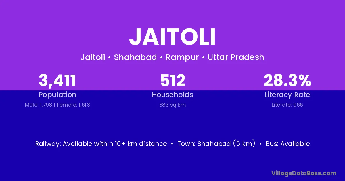 Shahabad (5 km) is the nearest town to Jaitoli village for major economic activities and is located approximately 5 km away.