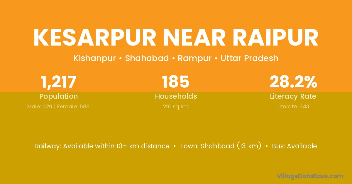 Shahbaad (13 km) is the nearest town to Kesarpur Near Raipur village for major economic activities and is located approximately 13 km away.