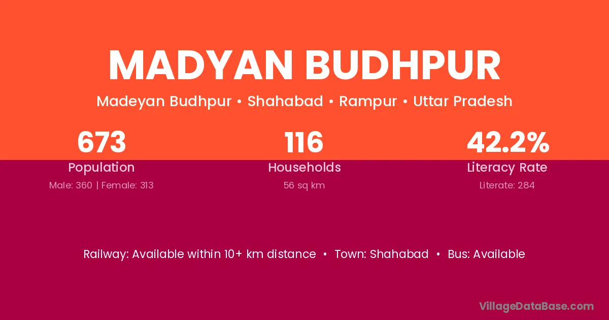 Madyan Budhpur village has a total population of 673 people, of which 360 are males and 313 are females.