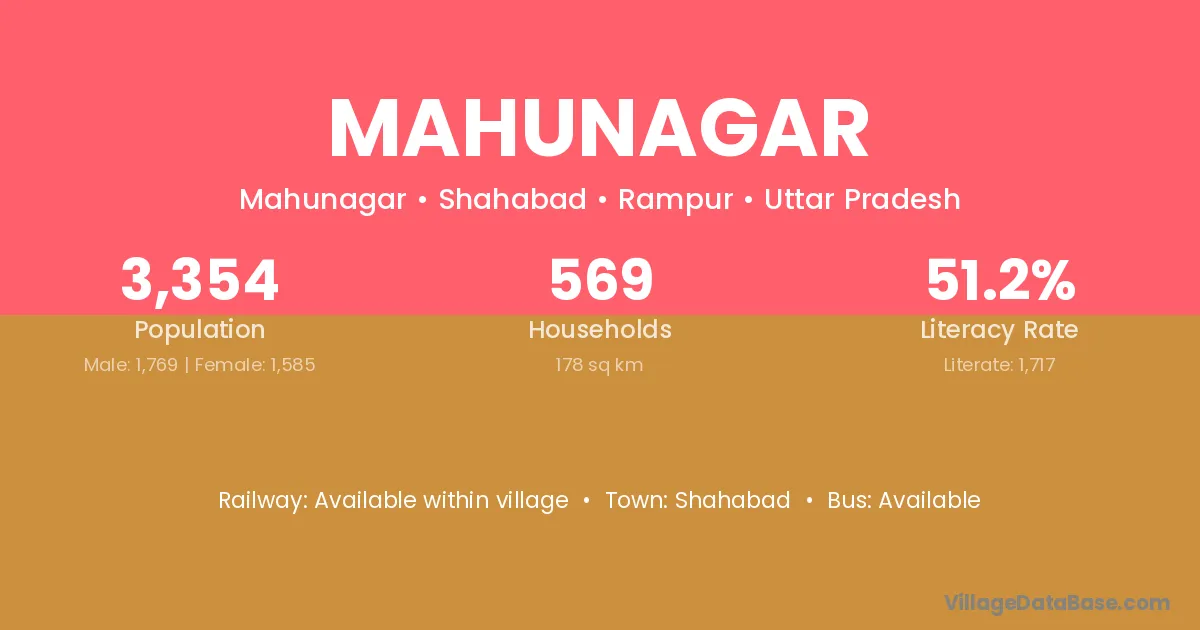 Mahunagar village has a total population of 3,354 people, of which 1,769 are males and 1,585 are females.