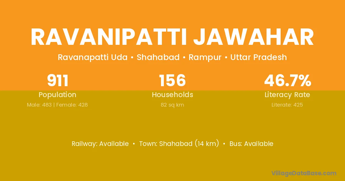 Ravanipatti Jawahar village has a total population of 911 people, of which 483 are males and 428 are females.