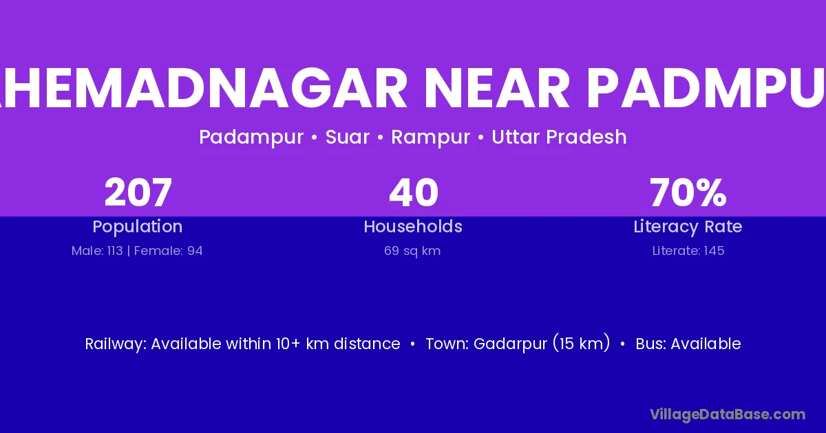 Gadarpur (15 km) is the nearest town to Ahemadnagar Near Padmpur village for major economic activities and is located approximately 15 km away.
