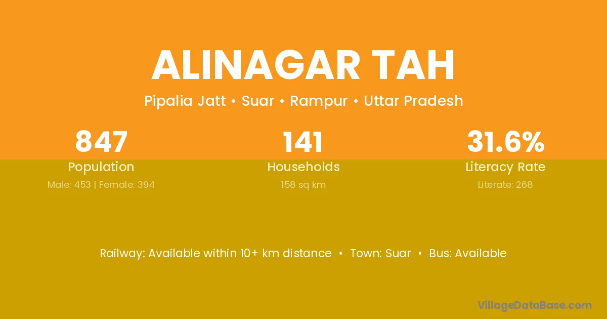 Alinagar Tah village has a total population of 847 people, of which 453 are males and 394 are females.