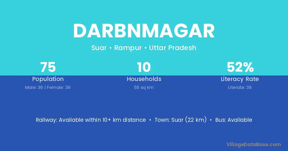Suar (22 km) is the nearest town to Darbnmagar village for major economic activities and is located approximately 22 km away.