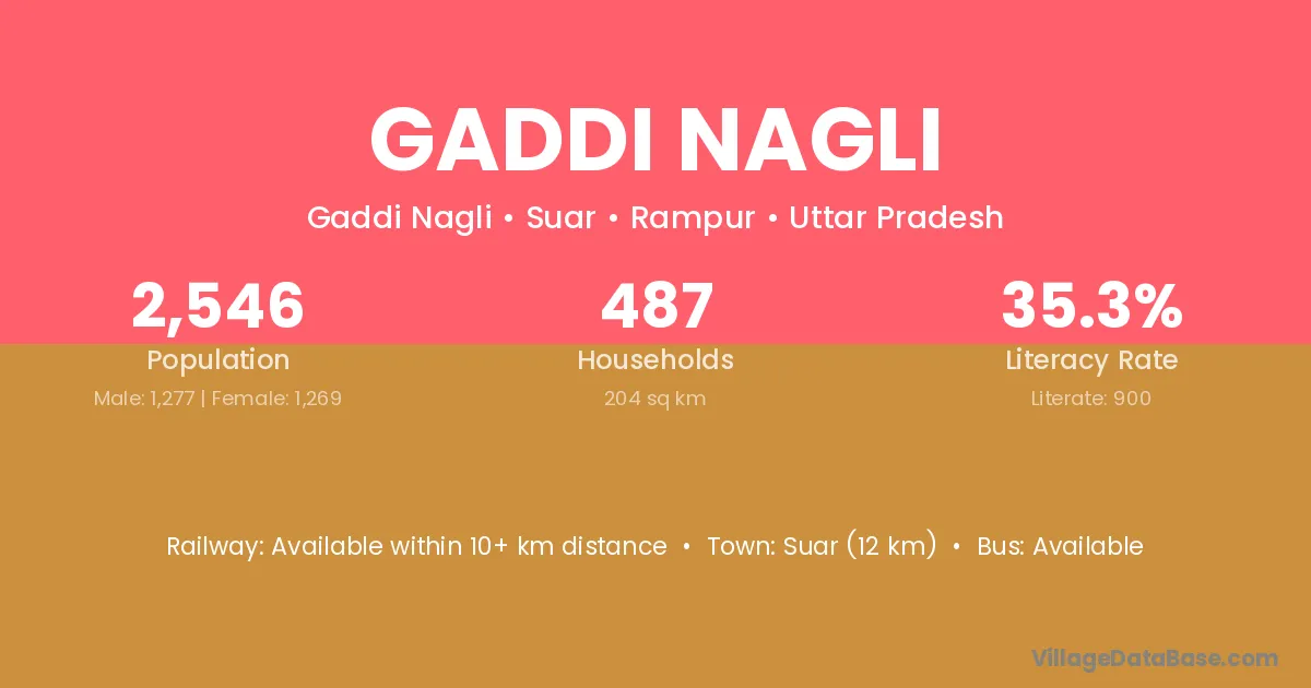 Suar (12 km) is the nearest town to Gaddi Nagli village for major economic activities and is located approximately 12 km away.