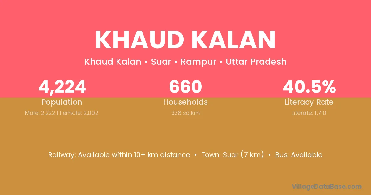 Suar (7 km) is the nearest town to Khaud Kalan village for major economic activities and is located approximately 7 km away.