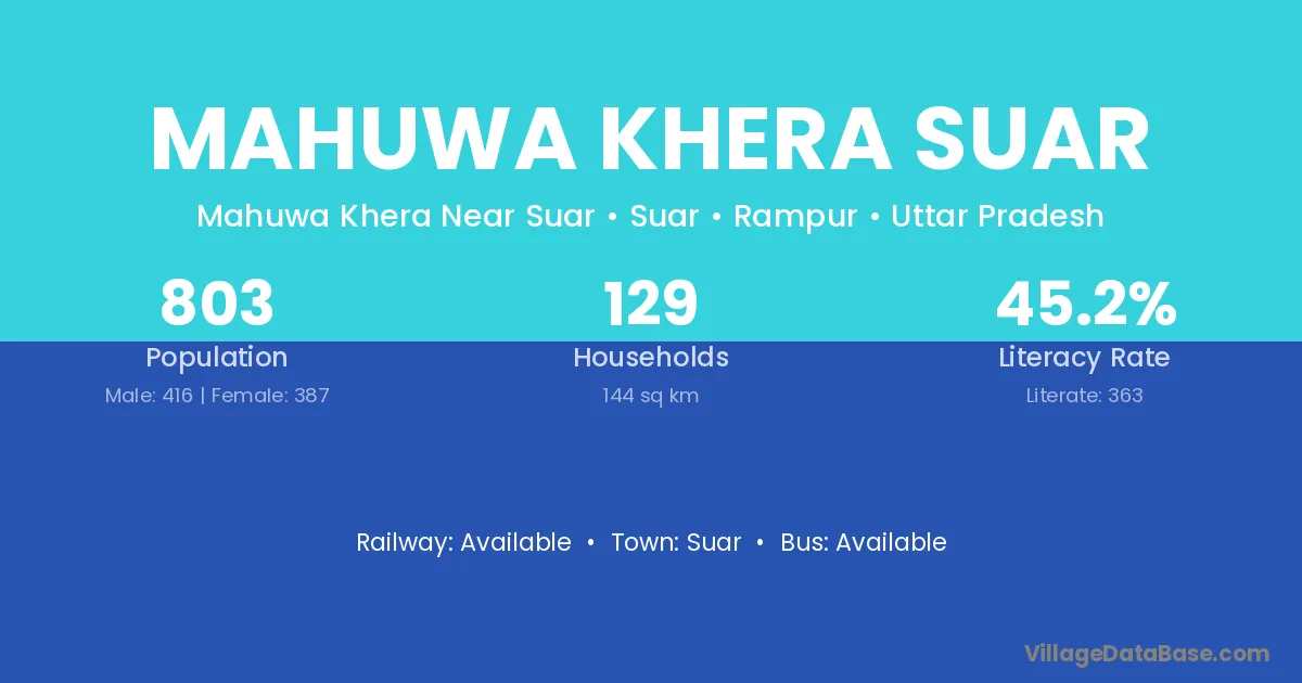 Mahuwa Khera Suar village has a total population of 803 people, of which 416 are males and 387 are females.