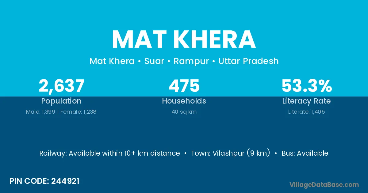 Mat Khera village has a total population of 2,637 people, of which 1,399 are males and 1,238 are females.