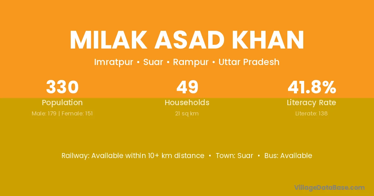 The literacy rate of Milak Asad Khan village is 41.82%. Male literacy stands at 50.84% and female literacy at 31.13%.