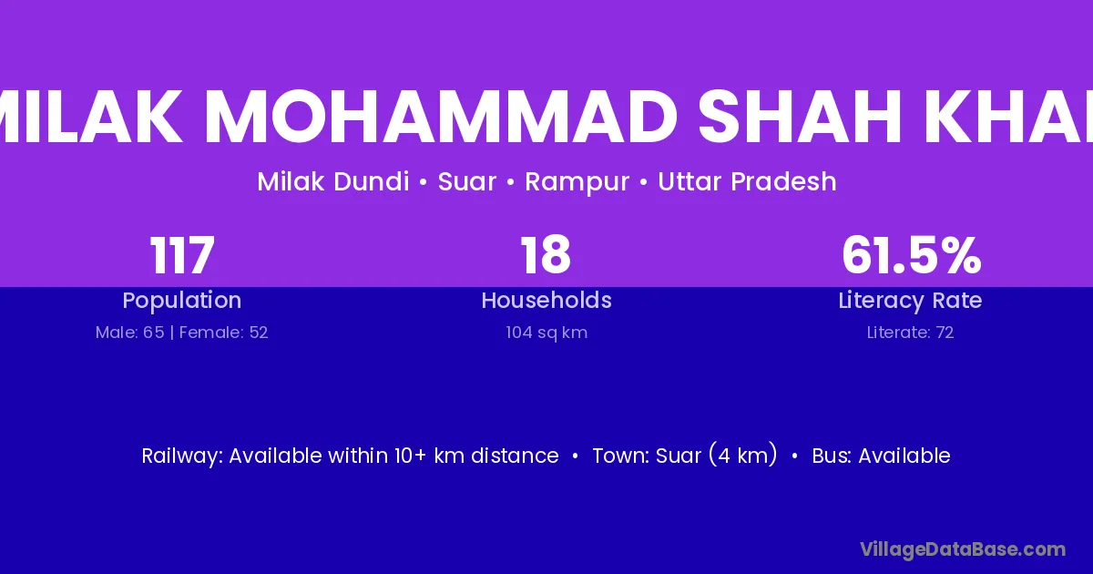 Suar (4 km) is the nearest town to Milak Mohammad Shah Khan village for major economic activities and is located approximately 4 km away.