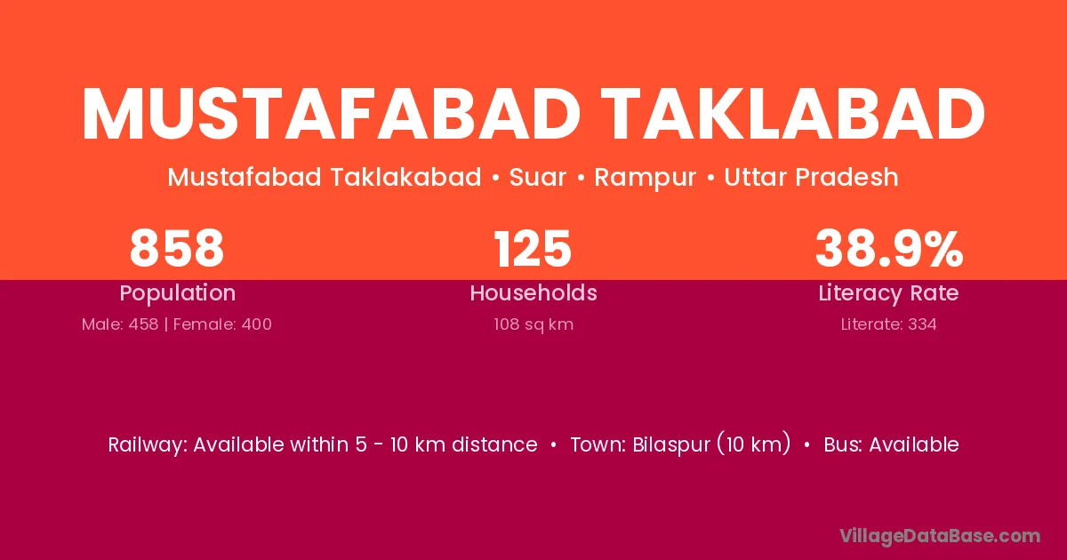 Mustafabad Taklabad village has a total population of 858 people, of which 458 are males and 400 are females.