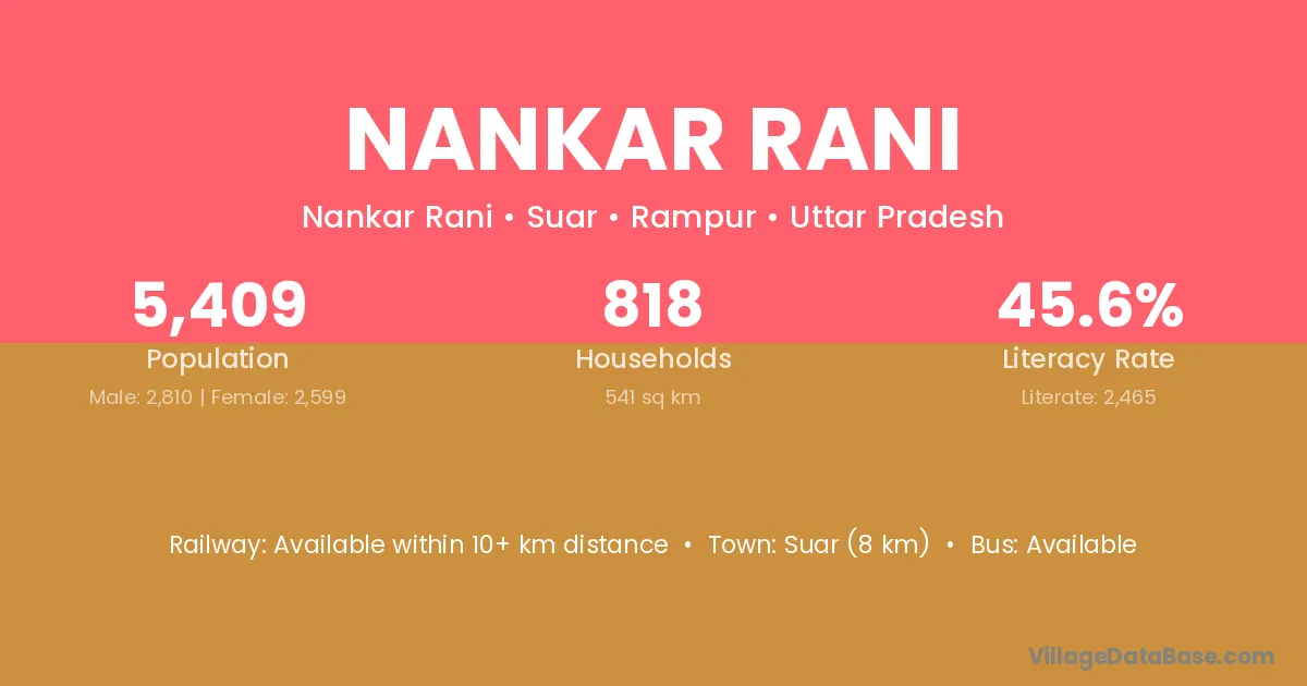 Suar (8 km) is the nearest town to Nankar Rani village for major economic activities and is located approximately 8 km away.