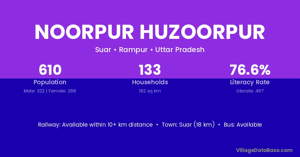 Suar (18 km) is the nearest town to Noorpur Huzoorpur village for major economic activities and is located approximately 18 km away.
