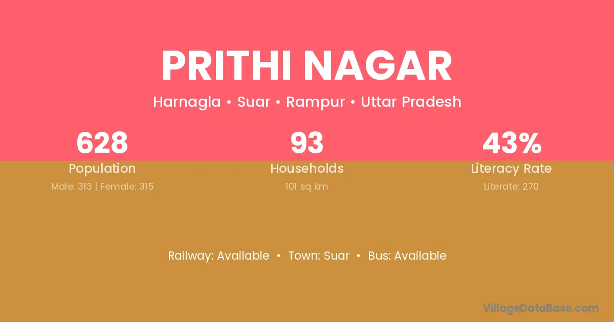Prithi Nagar village has a total population of 628 people, of which 313 are males and 315 are females.