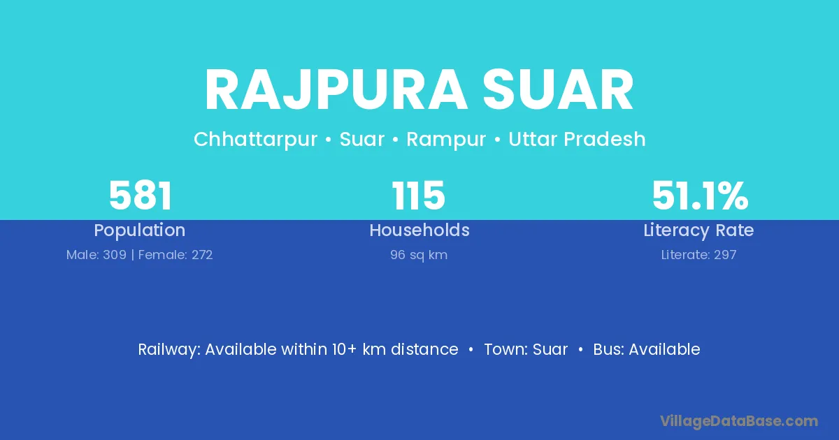 Rajpura Suar village has a total population of 581 people, of which 309 are males and 272 are females.