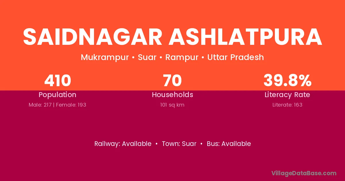 Saidnagar Ashlatpura village has a total population of 410 people, of which 217 are males and 193 are females.