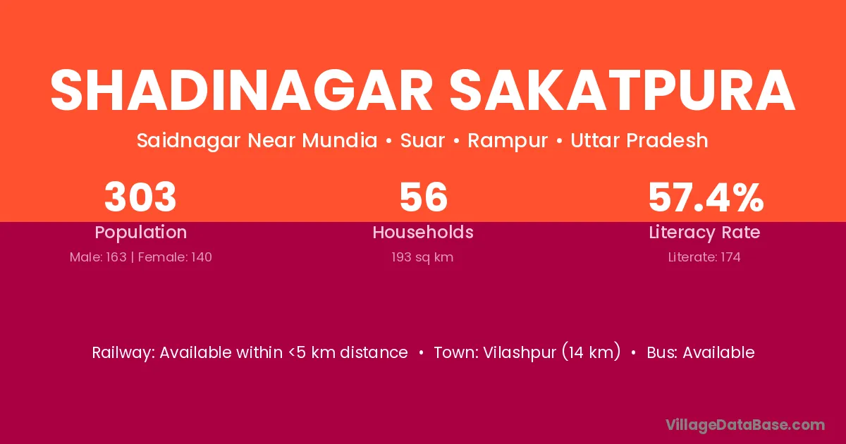 Vilashpur (14 km) is the nearest town to Shadinagar Sakatpura village for major economic activities and is located approximately 14 km away.