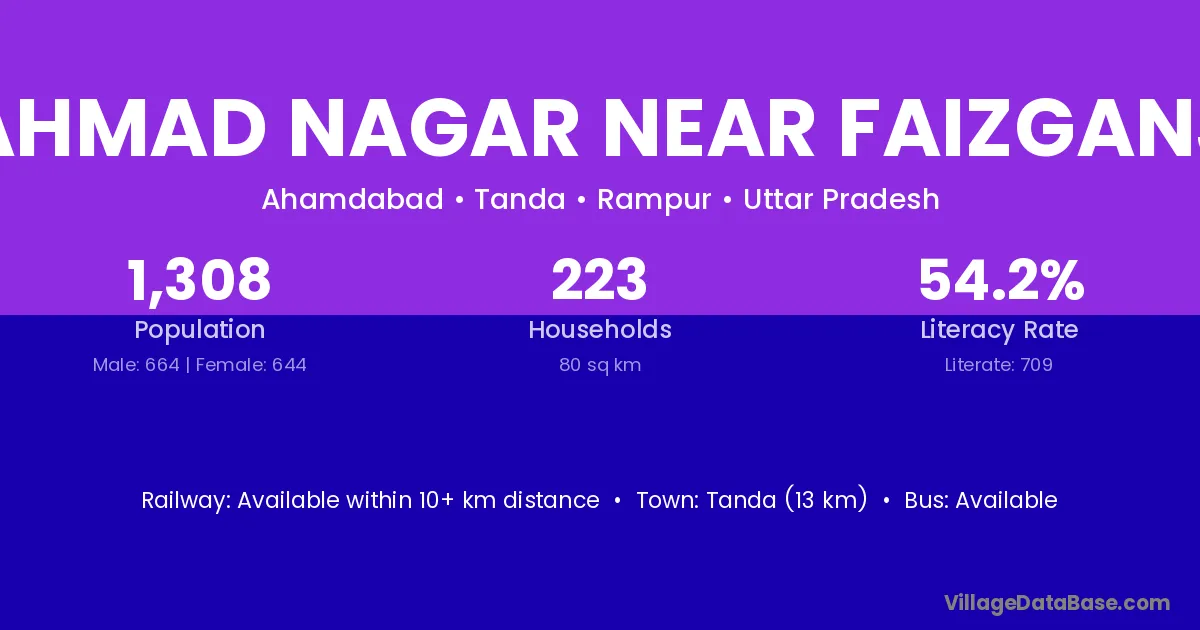 Ahmad Nagar Near Faizganj village has a total population of 1,308 people, of which 664 are males and 644 are females.