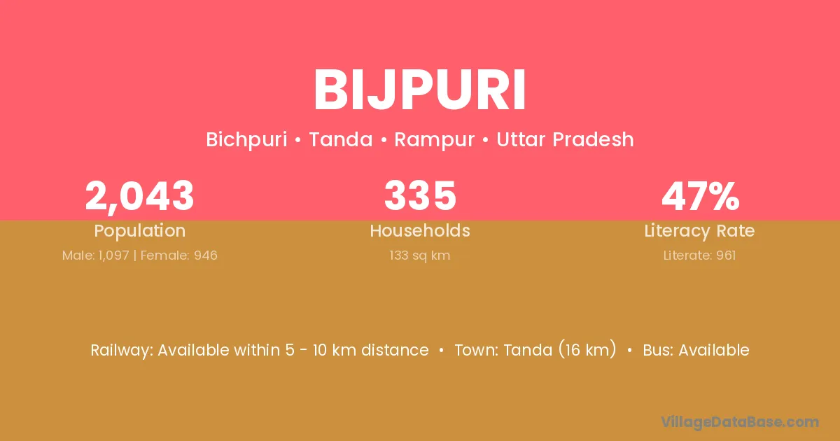 Tanda (16 km) is the nearest town to Bijpuri village for major economic activities and is located approximately 16 km away.
