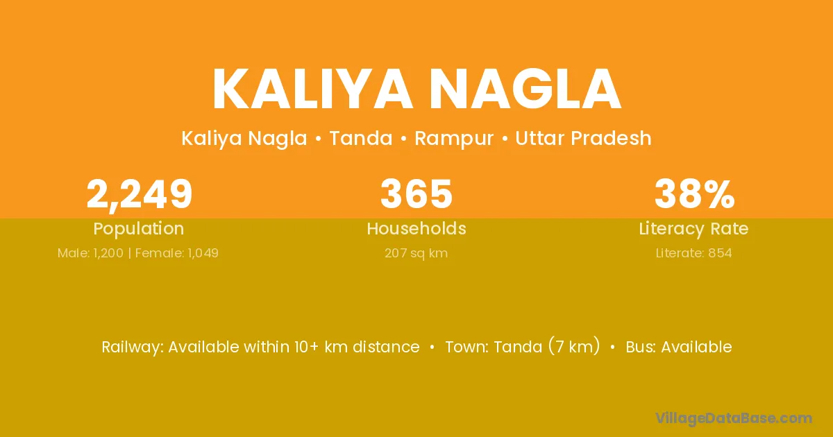 Kaliya Nagla village has a total population of 2,249 people, of which 1,200 are males and 1,049 are females.