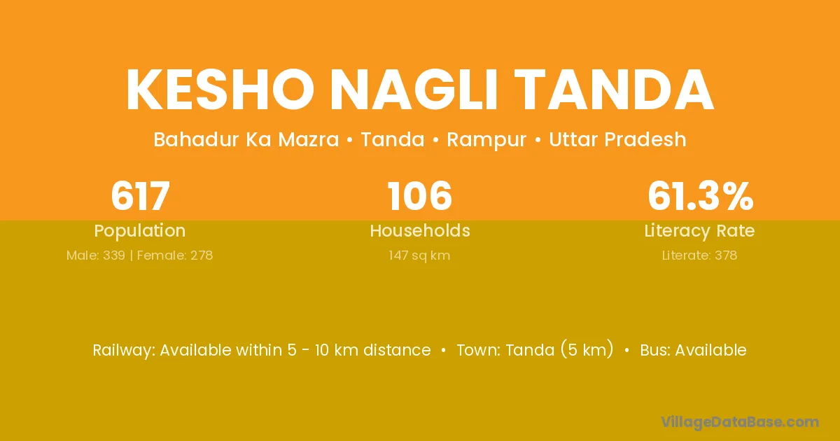 Kesho Nagli Tanda village has a total population of 617 people, of which 339 are males and 278 are females.