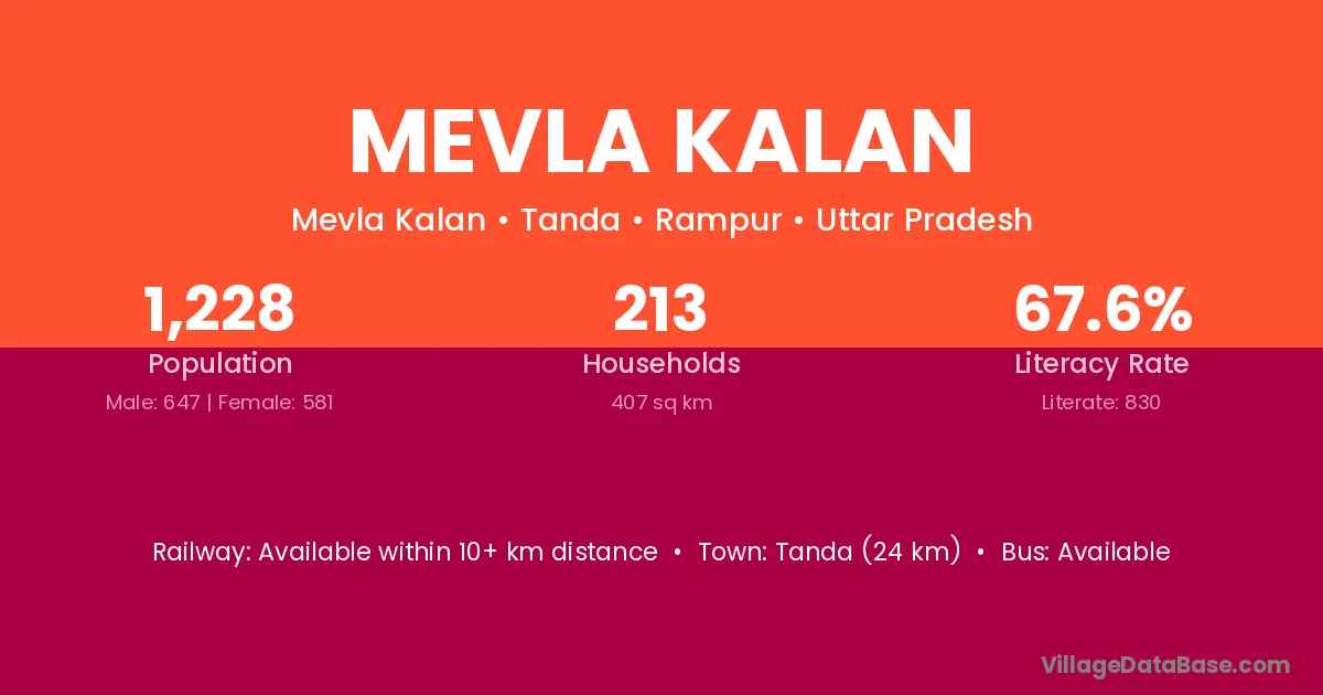 Tanda (24 km) is the nearest town to Mevla Kalan village for major economic activities and is located approximately 24 km away.