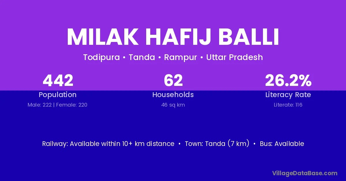 Tanda (7 km) is the nearest town to Milak Hafij Balli village for major economic activities and is located approximately 7 km away.