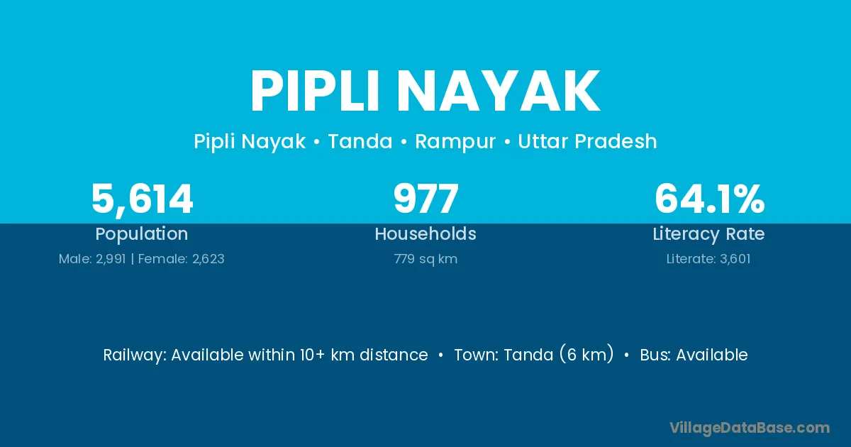 Tanda (6 km) is the nearest town to Pipli Nayak village for major economic activities and is located approximately 6 km away.