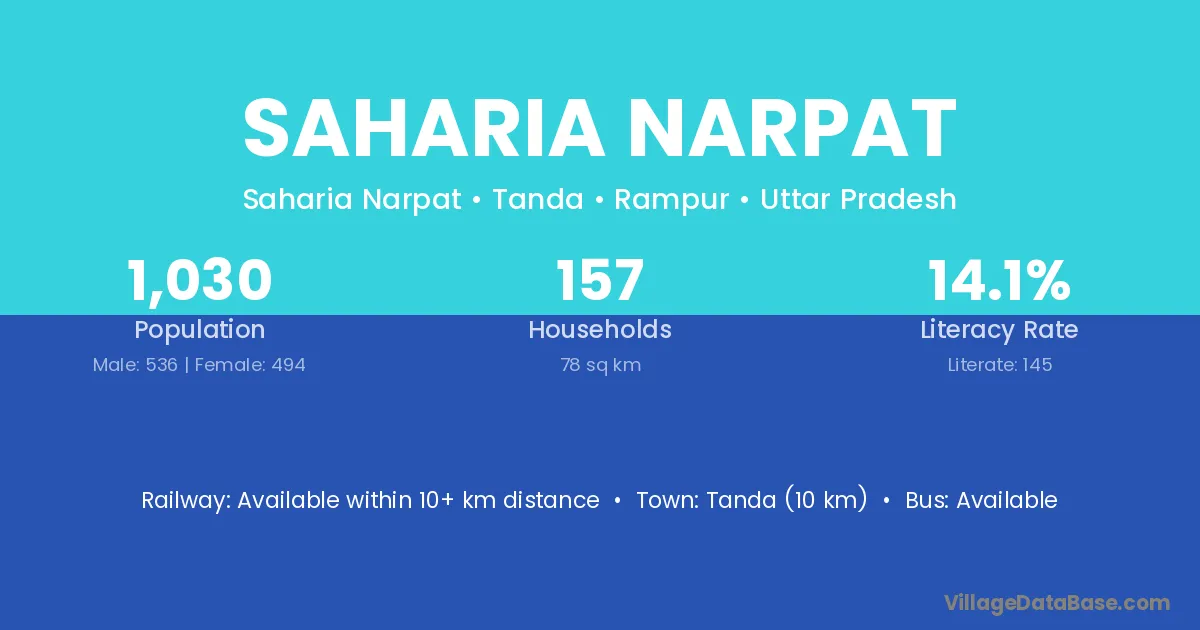 Tanda (10 km) is the nearest town to Saharia Narpat village for major economic activities and is located approximately 10 km away.