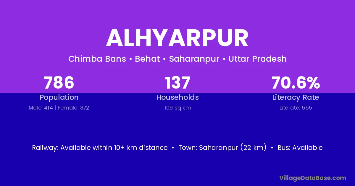 Saharanpur (22 km) is the nearest town to Alhyarpur village for major economic activities and is located approximately 22 km away.