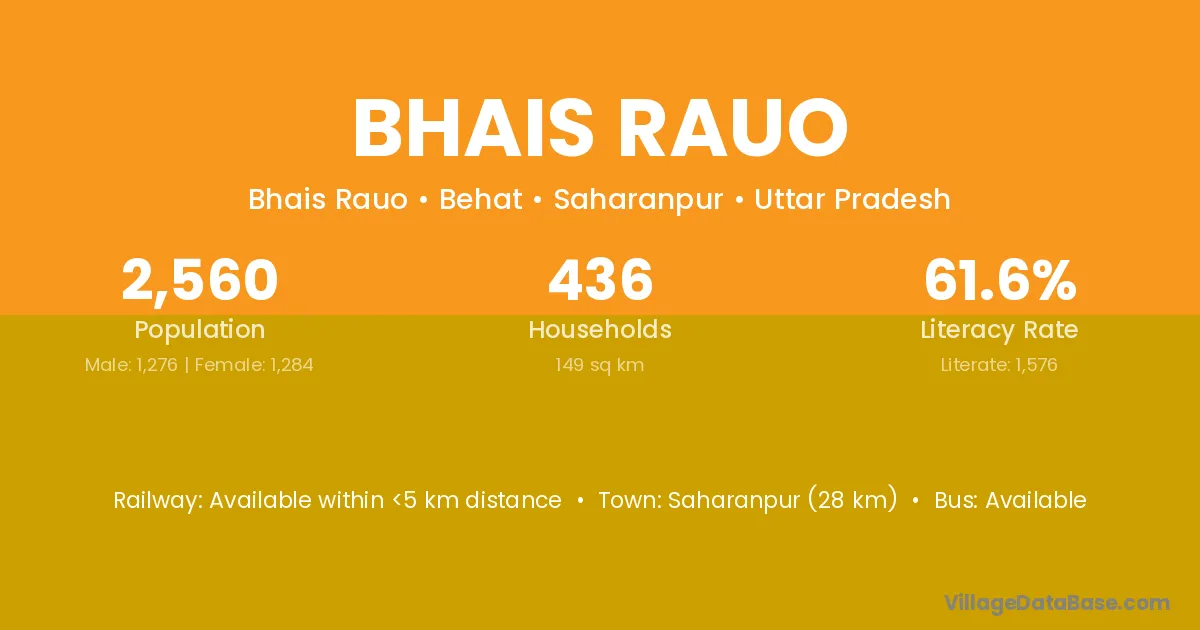 Saharanpur (28 km) is the nearest town to Bhais Rauo village for major economic activities and is located approximately 28 km away.
