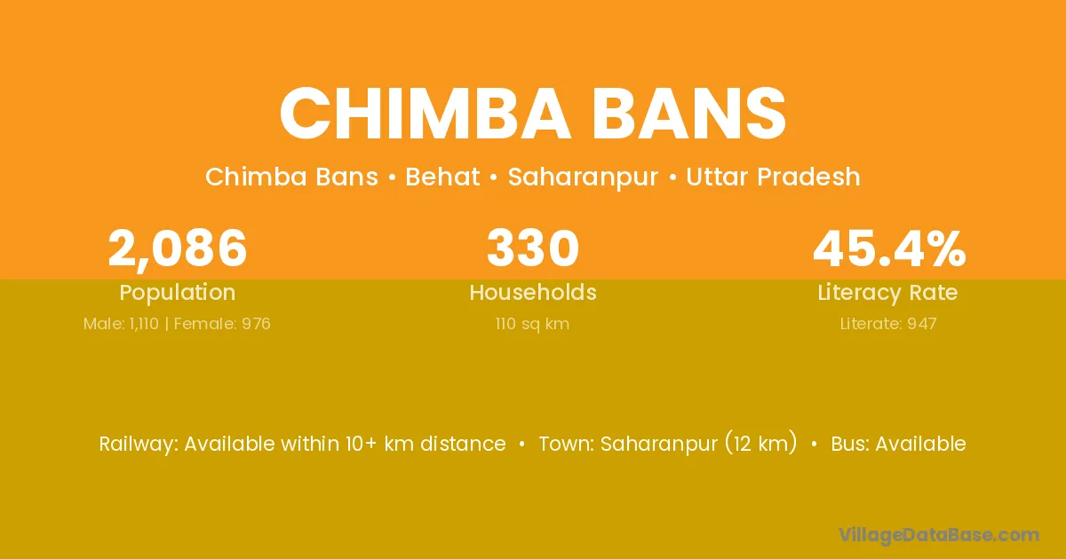 Saharanpur (12 km) is the nearest town to Chimba Bans village for major economic activities and is located approximately 12 km away.