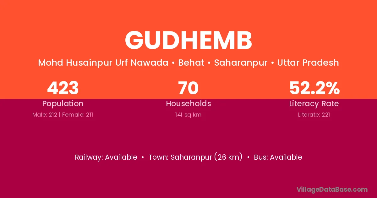 Saharanpur (26 km) is the nearest town to Gudhemb village for major economic activities and is located approximately 26 km away.