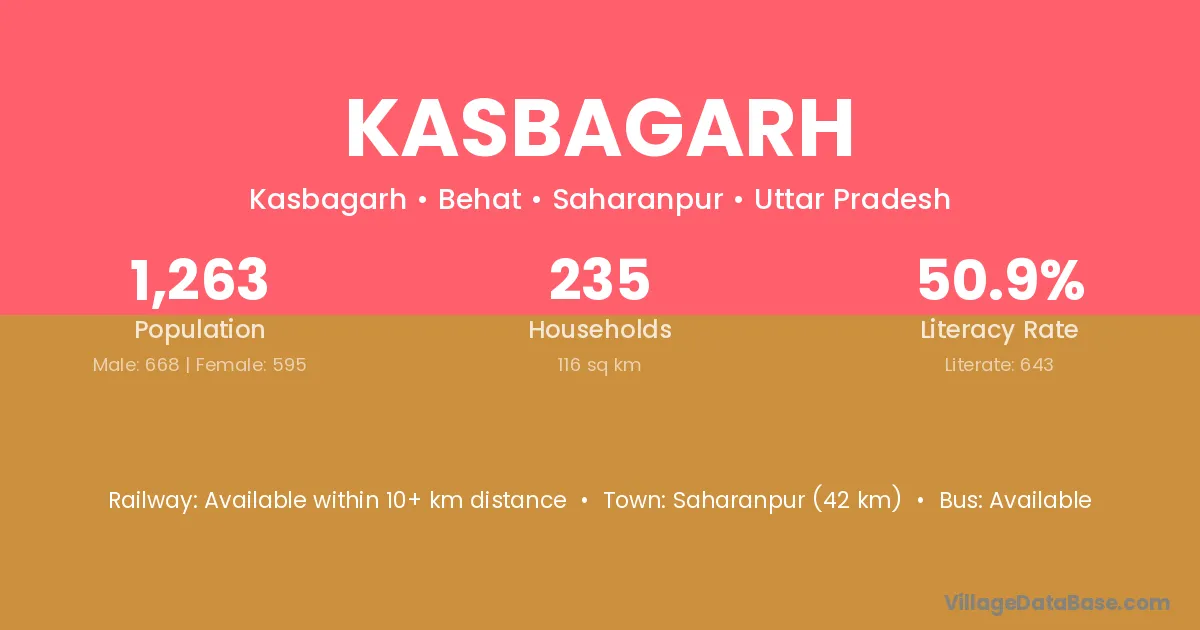 Saharanpur (42 km) is the nearest town to Kasbagarh village for major economic activities and is located approximately 42 km away.