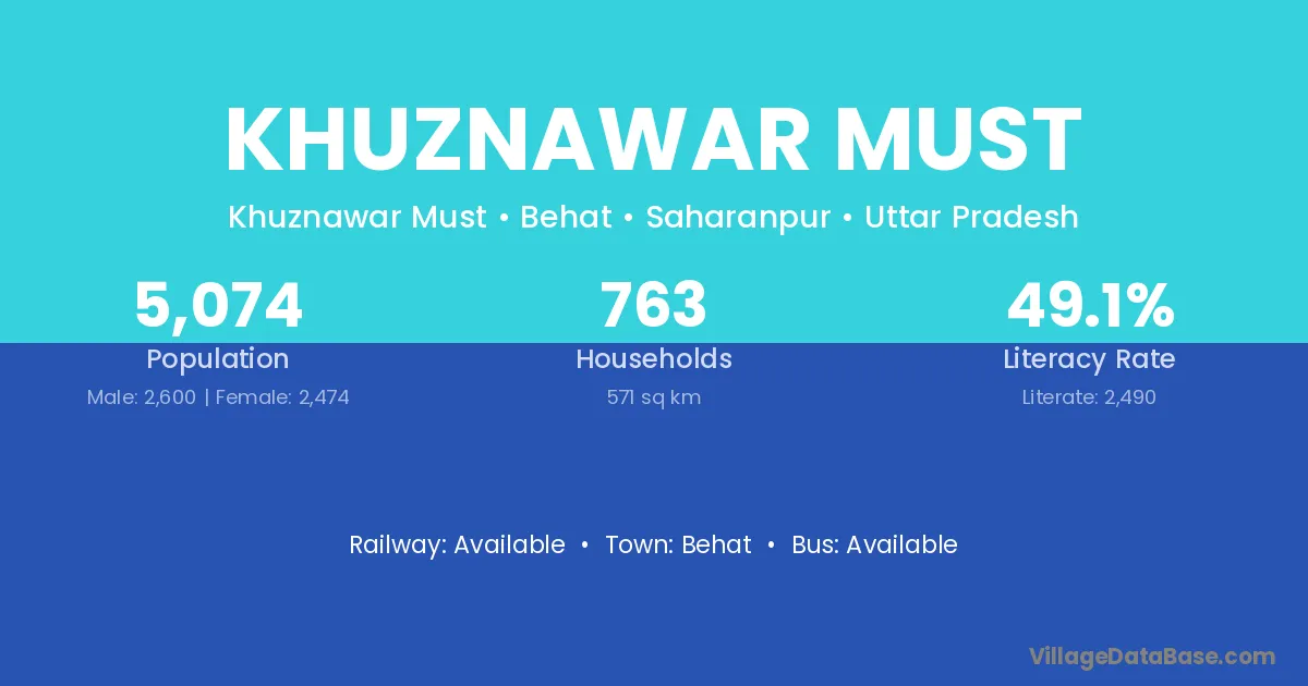 Khuznawar Must village has a total population of 5,074 people, of which 2,600 are males and 2,474 are females.