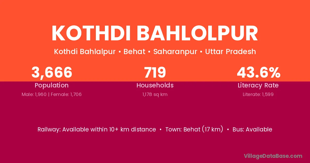 Behat (17 km) is the nearest town to Kothdi Bahlolpur village for major economic activities and is located approximately 17 km away.