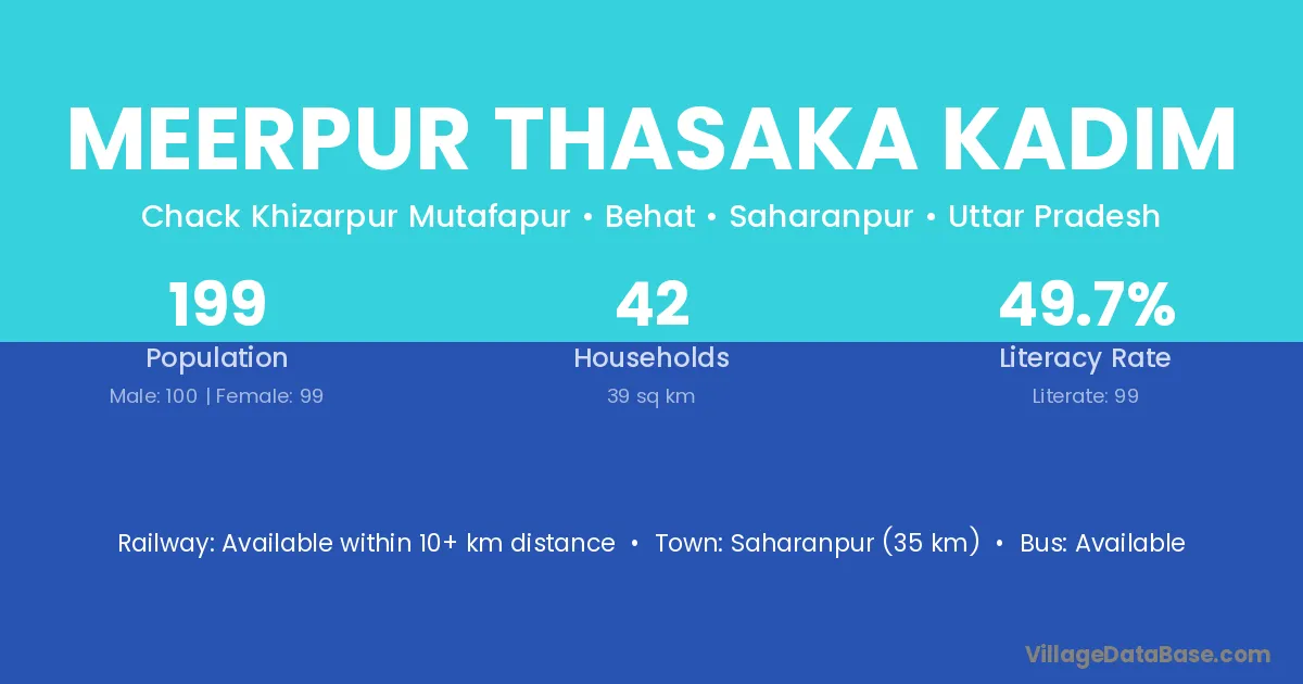Meerpur Thasaka Kadim village has a total population of 199 people, of which 100 are males and 99 are females.