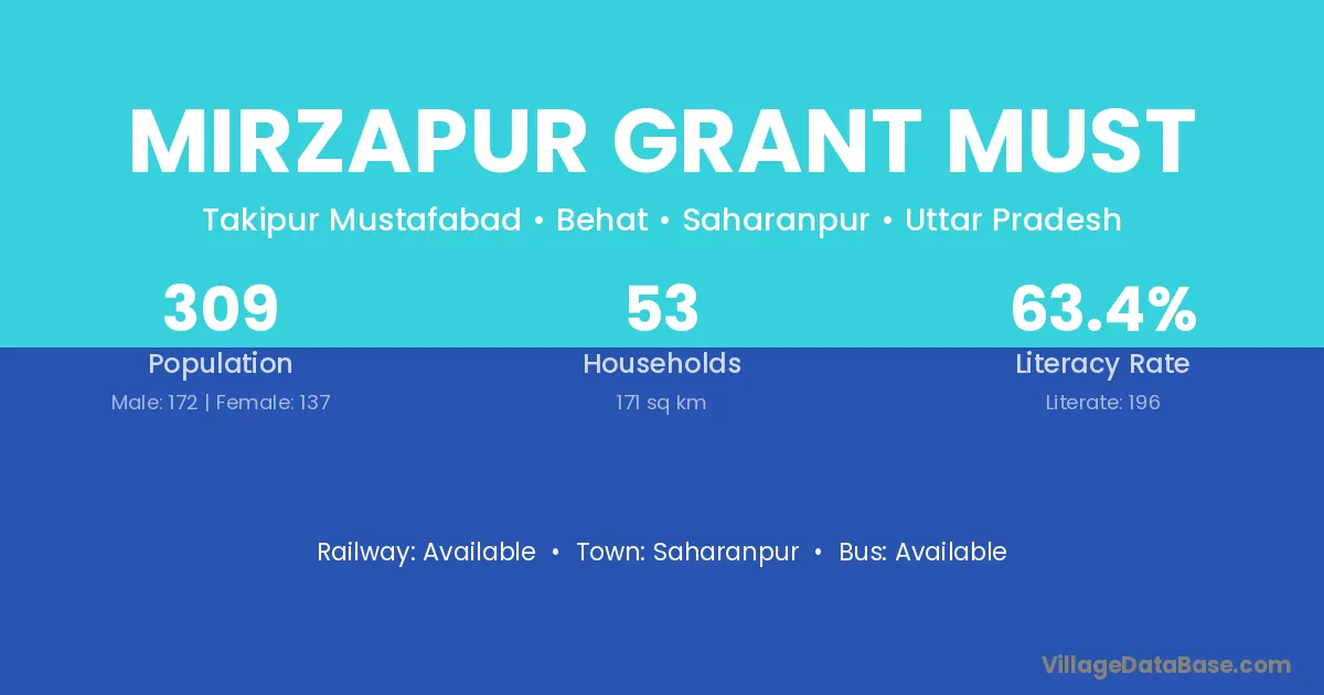 Mirzapur Grant Must village has a total population of 309 people, of which 172 are males and 137 are females.