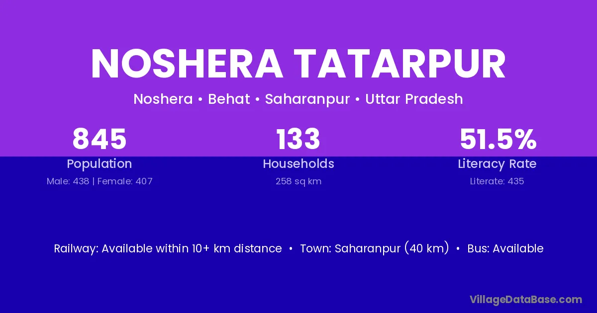 Noshera Tatarpur village has a total population of 845 people, of which 438 are males and 407 are females.