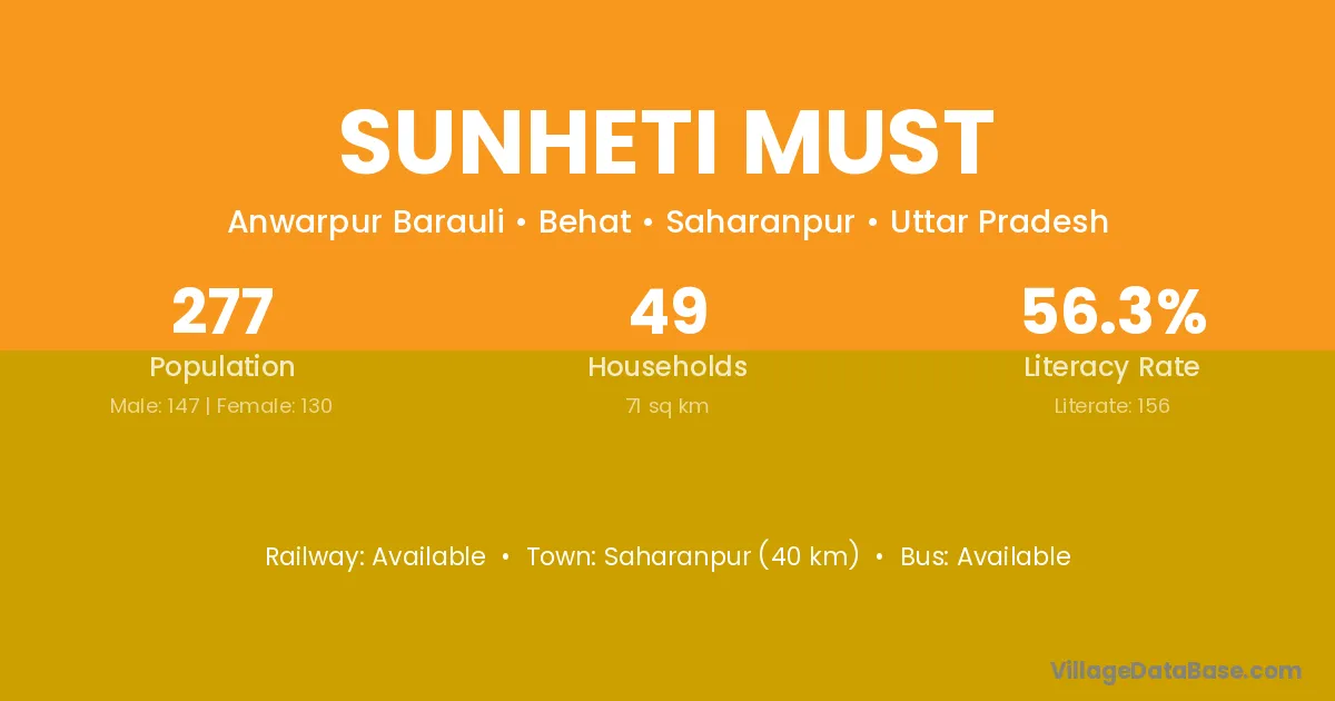 Saharanpur (40 km) is the nearest town to Sunheti Must village for major economic activities and is located approximately 40 km away.