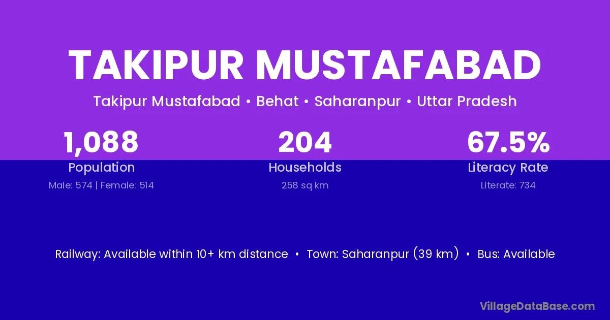 Saharanpur (39 km) is the nearest town to Takipur Mustafabad village for major economic activities and is located approximately 39 km away.