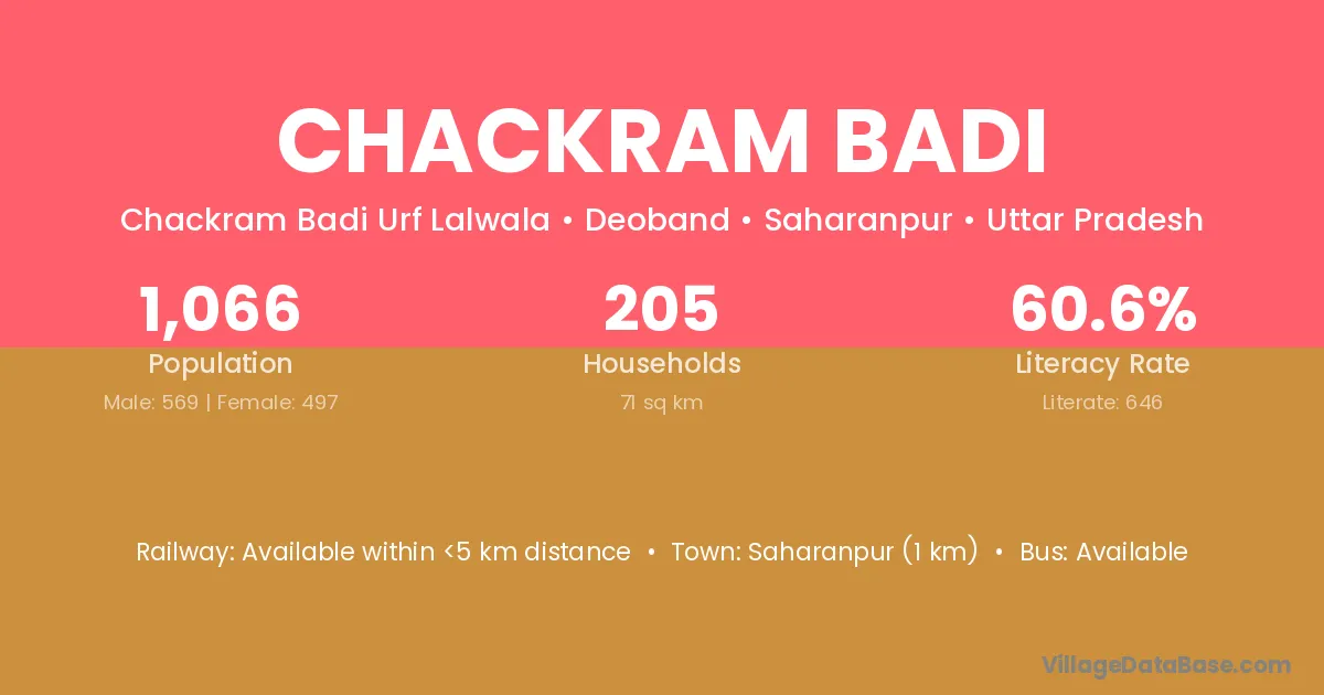 Saharanpur (1 km) is the nearest town to Chackram Badi village for major economic activities and is located approximately 1 km away.