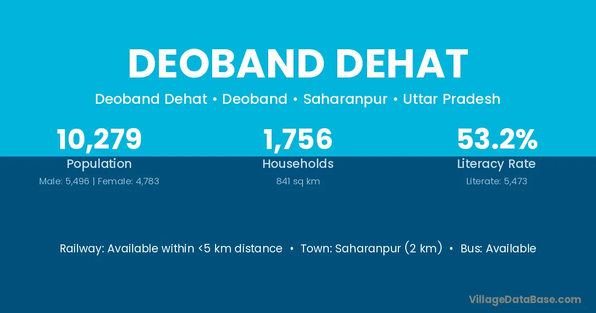 Deoband Dehat village has a total population of 10,279 people, of which 5,496 are males and 4,783 are females.