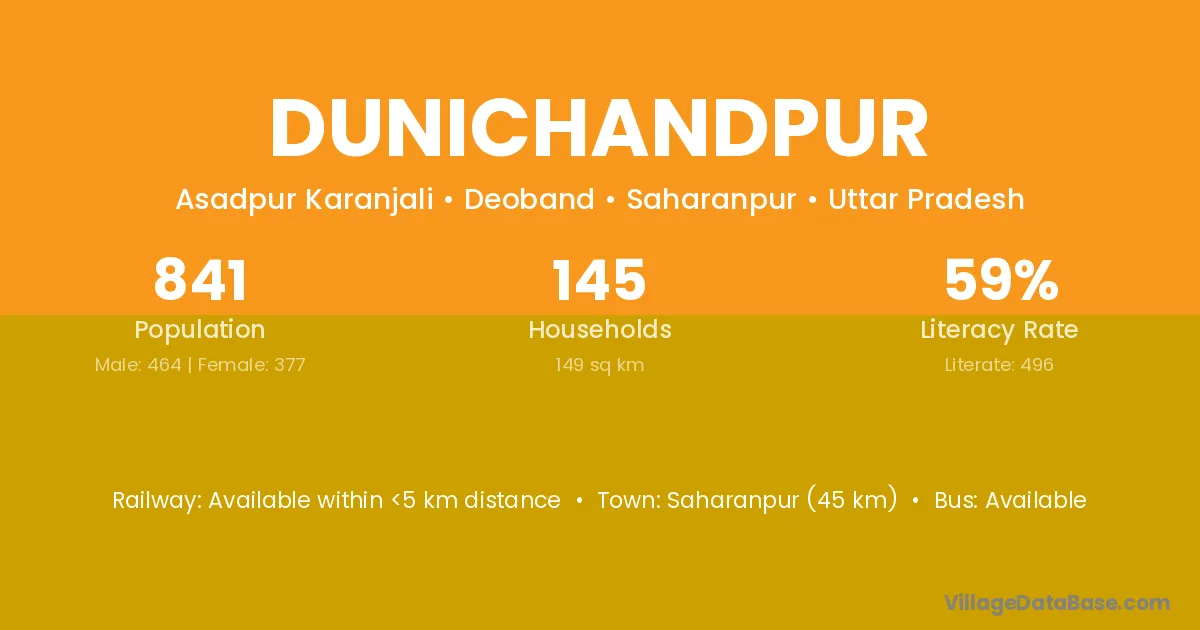 Saharanpur (45 km) is the nearest town to Dunichandpur village for major economic activities and is located approximately 45 km away.
