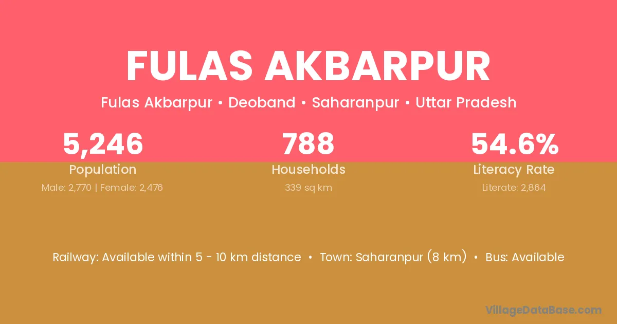Saharanpur (8 km) is the nearest town to Fulas Akbarpur village for major economic activities and is located approximately 8 km away.