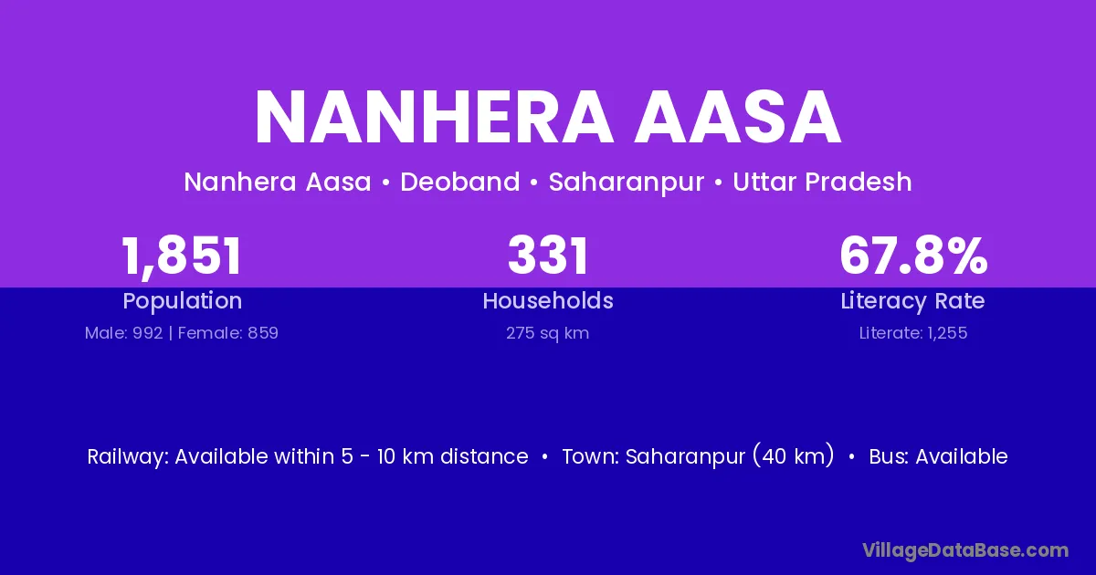 Saharanpur (40 km) is the nearest town to Nanhera Aasa village for major economic activities and is located approximately 40 km away.