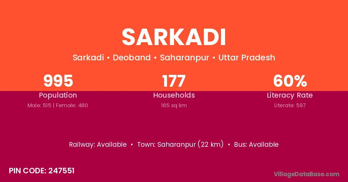Saharanpur (22 km) is the nearest town to Sarkadi village for major economic activities and is located approximately 22 km away.