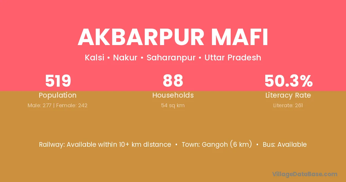Gangoh (6 km) is the nearest town to Akbarpur Mafi village for major economic activities and is located approximately 6 km away.