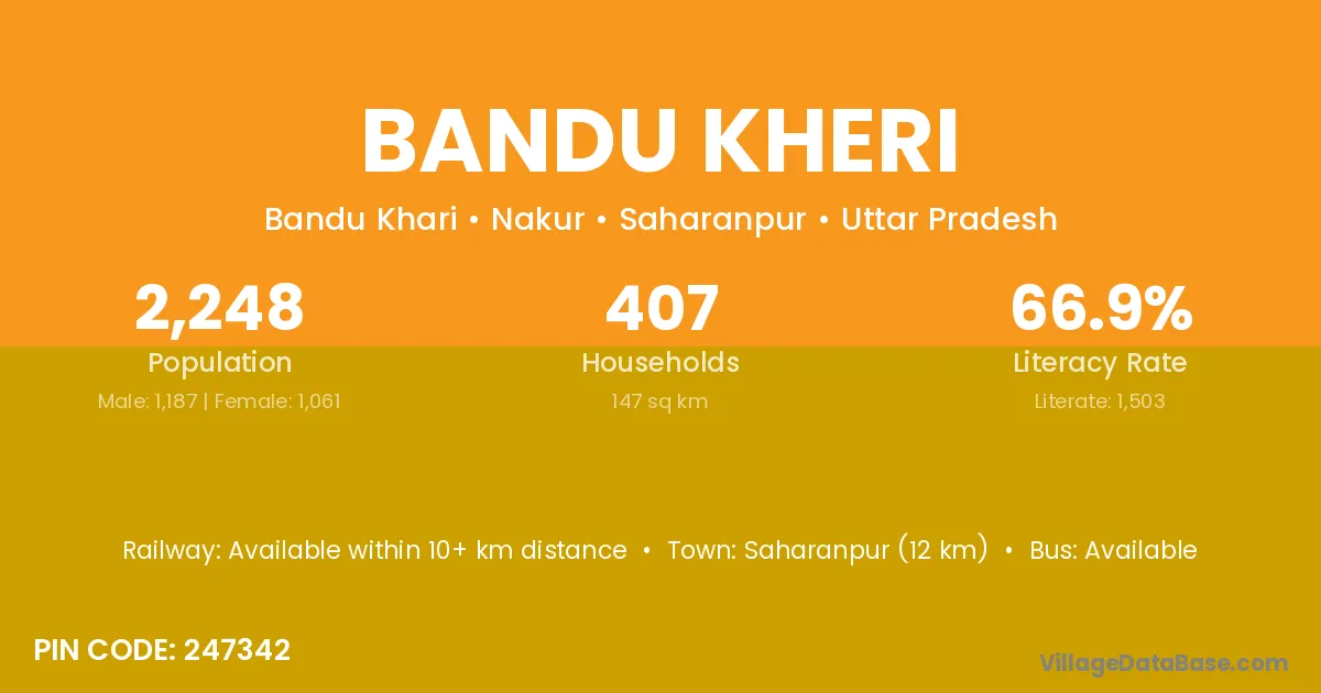 Saharanpur (12 km) is the nearest town to Bandu Kheri village for major economic activities and is located approximately 12 km away.